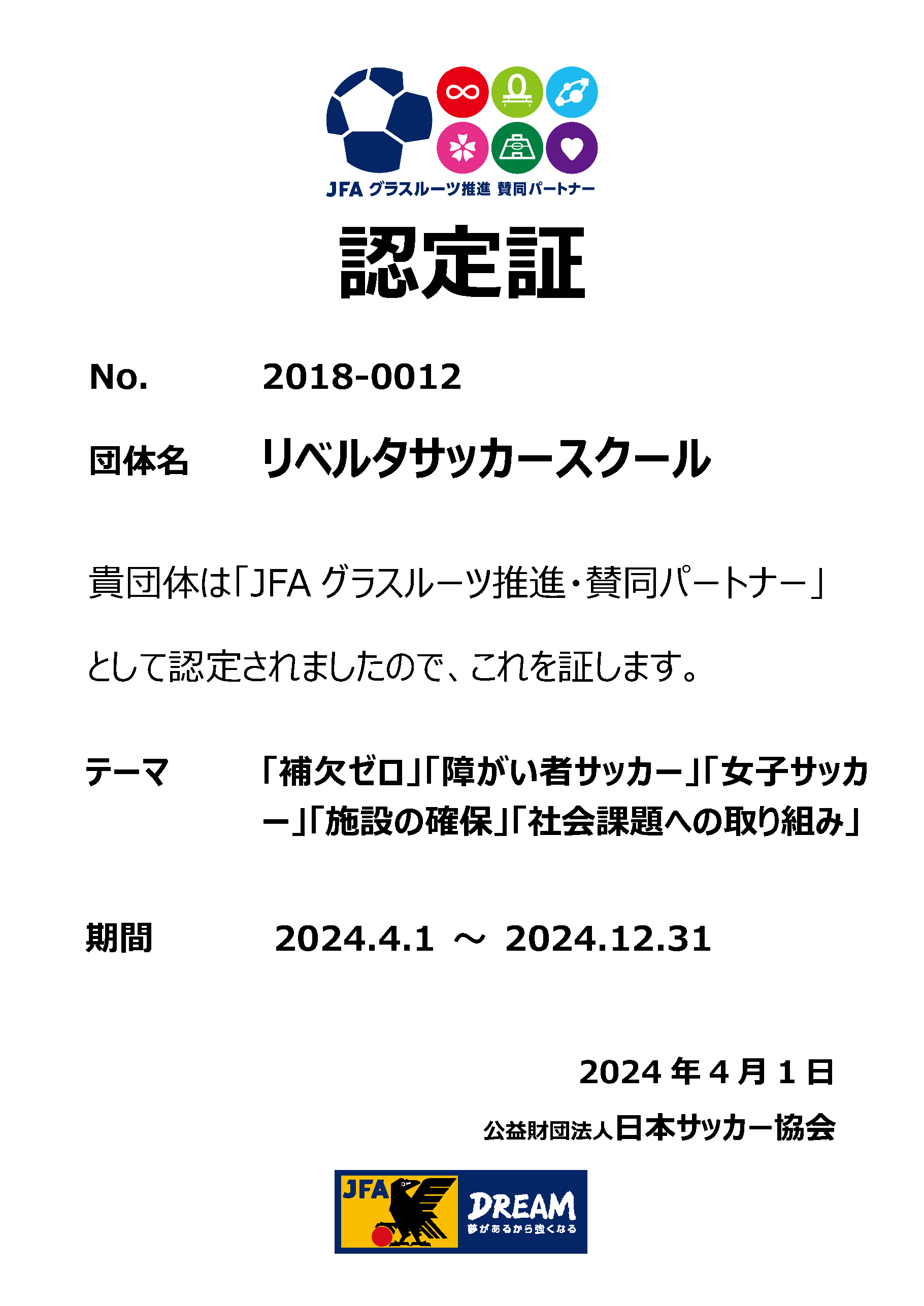 このたび、リベルタサッカースクールが、日本サッカー協会(JFA)の認定制度である「グラスルーツ推進・賛同パートナー」に7年連続で認定されました!