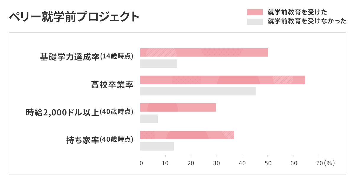 その結果、幼児教育を受けたグループの子どもは、受けなかった子どもより、14歳のときの基礎学力が高かったり、高校を卒業している子どもの割合が20パーセント高かったりといった、教育的な効果があることが分かったのです。