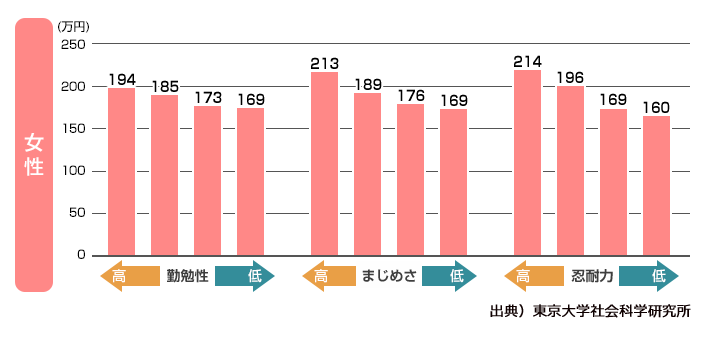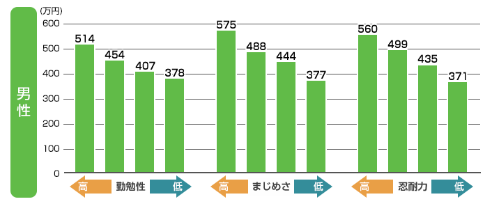 日本でも年収に関する研究が行われており、東京大学社会科学研究所が発表した調査結果では、非認知能力の一つである真面目さが最も高い男性グループと最も低い男性グループを比較すると、平均年収でなんと、約200万円の差があることが判明しております。